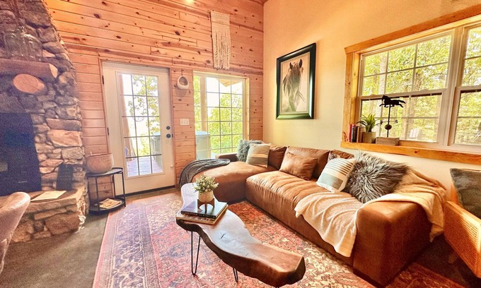 Relax & Reconnect at The Hilltop Cabin nestled along the picturesque hills of Northeast Arkansas. This cabin has beautiful views of The Eleven Point River which is known for fishing, swimming, kayaking, canoeing, and tubing in the summer. We offer float accommodations designed specifically for your cabin & guests! This cabin offers natural light through a multitude of windows. It is equipped to offer a romantic getaway or some much needed,"me time." The Hilltop features a gorgeous indoor/outdoor stone fireplace with vaulted ceilings. A warm and inviting hot tub on deck that overlook the gorgeous river valley, Inside you'll find a master bedroom which includes a king size bed and ensuite master bath with claw foot tub and electric fireplace. We have also added in a full size murphy bed. There is a loft which includes a couch, recliner, full size bed, queen size air mattress, & twin size cot. There is another full size bathroom located downstairs that includes toilet/walk in shower.