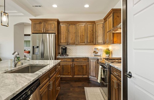 Retreat to the luxurious master suite, which boasts a spacious bathroom with a soaking tub, stand-up shower, double sinks, and a walk-in closet. As you approach the front door, be enchanted by the beautiful waterfall feature and softly lit stairs leading you home.