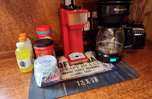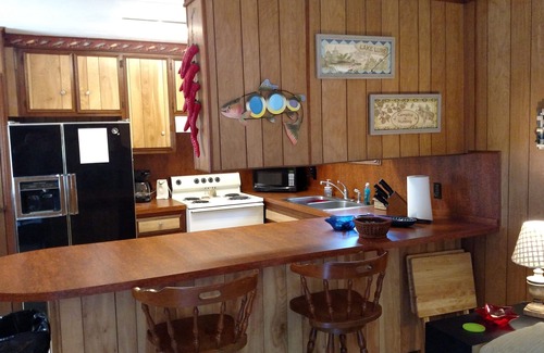 Cabin #7 is a comfortable 3 bedroom , 1-1/2 bath mobile home that sleeps 8. The bedrooms contain 2 twin beds, a full and a queen bed. The living room has 2 large sofas for additional sleeping. The kitchen is fully stocked with a side-by-side refrigerator, electric stove, microwave, drip coffee maker, k-cup coffee maker, cookware, dishes, glasses, coffee mugs, utensils.