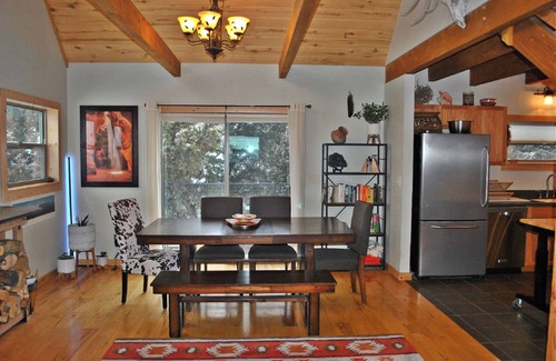 The Space- The cabin sits on 17 acres, home to juniper trees, pinion pines and various wildlife including turkeys, deer, eagles, ravens and bobcats. Beautiful 2 bedroom (both memory foam queen beds), 1 bath, and pullout couch. Delightfully furnished with a Southwest vibe and all new appliances. Outdoor areas include a fenced-in dog yard, a treehouse, a patio with a fire pit and our picturesque porch with a propane grill. Inside, the kitchen has all basic cooking supplies and spices, a stainless steel fridge, wood and leather dining room set, and a rolling island for additional cooking or serving space. The wood burning stove in the living room is perfect for those cool nights!