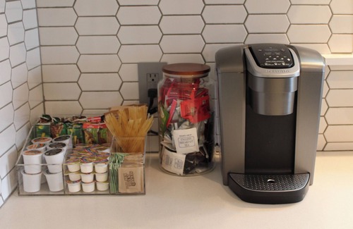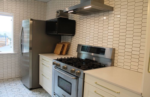 Refrigerator with ice and water dispenser along with a Brita water pitcher inside. Commercial size oven and gas stove top. Dishwasher. Keurig coffee maker with complimentary coffee pods, 1/2 & 1/2 creamers, raw sugar, stevia, and honey. Other coffee brewing methods such as Moka pot, French press, and pour over. Electric water kettle. Herbal and caffeinated teas. Pots, pans, and baking sheets. All the basic cooking utensils. Toaster. Blender. Fire extinguisher.