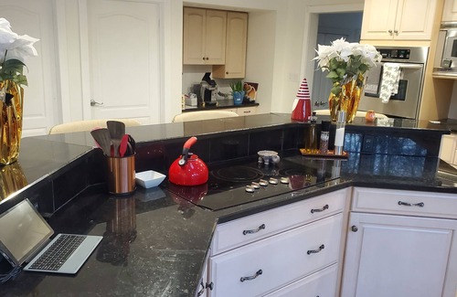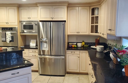 Planning an extended stay and want to cook your own meals? The chef's kitchen is stocked with a coffee maker, blenders, a commercial mixer, food processor, 6-in-1 rice cooker, pots, pans, knives, utensils, dinnerware, serving trays and place settings. Also plenty of room for groceries in all the cabinets and in a Pantry right off the kitchen. The first floor large laundry room is equipped with a washer, dryer, sink, full sized ironing board, iron and cleaning supplies.