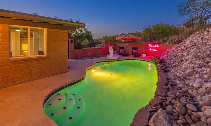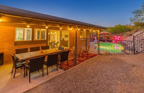 Welcome to SaguarOasis! Nestled between the Catalina Mountains, Saguaro National Park and Downtown Tucson, our upscale retreat offers a relaxing break from reality. Perched on a hill on a dead-end secluded street, our spacious 2300-square-foot home sits on an acre of land. Let the abundance of space and gathering areas envelop you. Dip into the sparkling pool, bask in the sun, and relish the panoramic views of the desert and mountains that stretch before your eyes. At night, take in the stunning sunset view from a cozy Adirondack chair around the backyard firepit. Kid & Family Friendly!