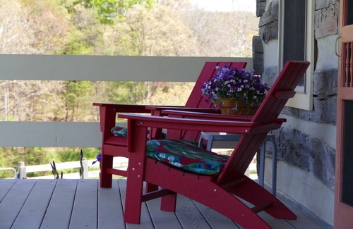 This unique retreat has been designed and furnished with visitor's enjoyment in mind including: self-check-in and check-out, tons of privacy, original art, a modern fully equipped kitchen — outfitted with a Samsung gas range and Keurig coffee maker with morning coffee or tea provided — a super comfy Queen sleigh bed with bed & bath linens, soaps, and shampoo also provided. Log on to a secured wireless network, watch Apple TV and Hulu Live, or use the Calm app to super chill. Enjoy a large sunny back deck, a lovely covered front porch with drop-dead gorgeous mountain views—all on seven private acres. Plus, there is a paved drive to get you up the hill to the house, (a real bonus in a rural area filled with bumpy gravel drives) that gently curves down to the barn, perfect for a short relaxing walk.