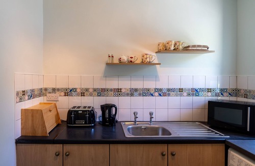 The gallery styled kitchen is fully equipped with fridge freezer, microwave, oven and ceramic hob and washing machine.