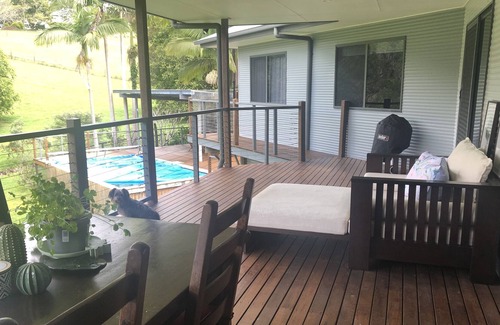 Comfortable, Private and Spacious property situated in the hinterland. Eumundi and Yandina markets just minutes away and 25 minutes to Hastings Street and Gympie Terrace in Noosa. Relax Poolside and enjoy a BBQ on expansive decks. Enough room to play cricket or kick a footy around!