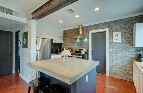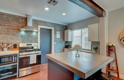 If eating in is more your style, our kitchen features stainless steel appliances, gorgeous concrete floors, exposed brick wall, ample counter space and an island where you can enjoy your home made meals! The kitchen comes equipped with a refrigerator, stove, oven, dishwasher, coffee makers, tea pot, plates, bowls, cutlery, drinking glasses, pots and pans, and more!