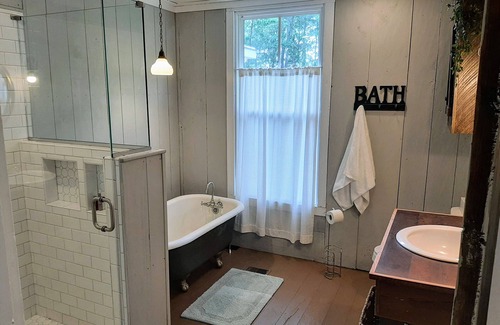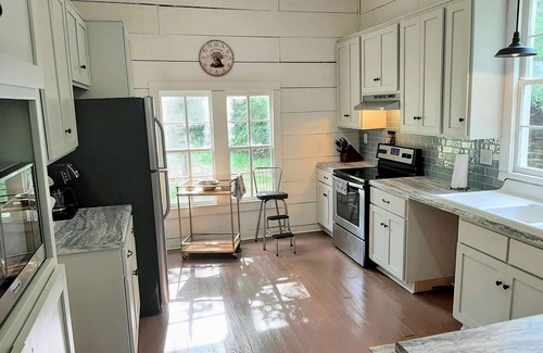 Enter into a lovely wide foyer hall that goes the length of the home, inspired by dogtrot breezeways of original Southern homes. Enjoy a spacious master bedroom with adjoined private bathroom featuring a standing shower and vintage clawfoot tub (with a backyard view), grand dressing mirror, vanity, dresser, lounging sofa, and full sized bed. Plenty of windows in every room in the house provide a cheerful, sunny ambience throughout the day. This historical farmhouse has been modernized with A/C, renovated kitchen, and updated guest and master bathrooms. It has been kept in the most original condition in which we found it, including original floorplan, color palette, surface materials, and some furniture. A full kitchen is available for use, along with outdoor grills for a little cookout. Washer and dryer are also available during your stay.