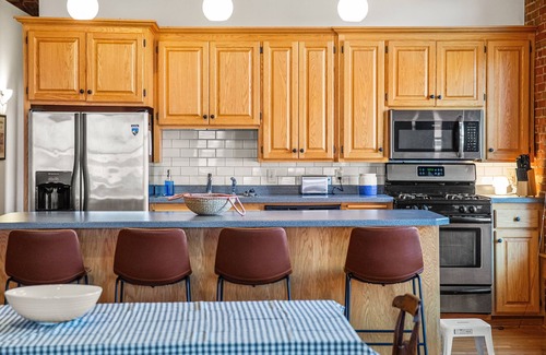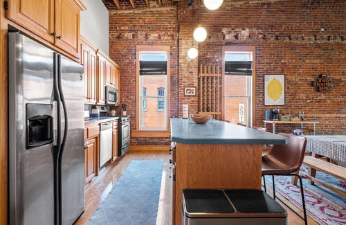 This spacious historic loft is quintessentially Stillwater with its 20 foot exposed beam ceilings and brick walls, all original from when the building was constructed in the 1880's. While it is preserved of it's historic charm, this 2 bedroom loft has been updated with modern amenities like a jacuzzi tub and fully outfitted kitchen for those looking to do some cooking with the produce from the coop down the street.