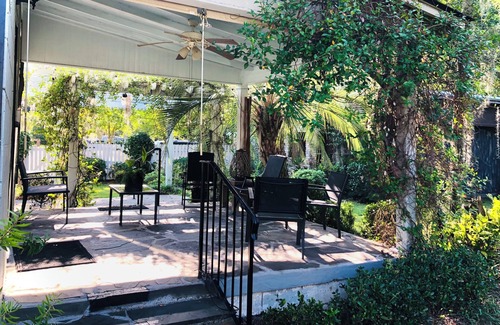 The back porch offers a relaxing area, with seating for 6, underneath a ceiling fan and twinkle lights. A gas grill is provided. We are pet friendly. We recommend that you maintain your pets on a leash while outdoor and clean up after your pets. We have provided water and food bowls, as well as treats and poop bags.