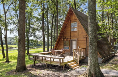 The Chalet is a lovely redwood a-frame cabin that sleeps 4. It has a Queen Murphy Bed on the main level and a queen bed in the loft area, accessed by spiral staircase. One full bathroom with stall shower and stocked with linens. Kitchenette with small appliances and dishes. Large deck on the back with a patio table set overlooking the pond and beautiful landscape.