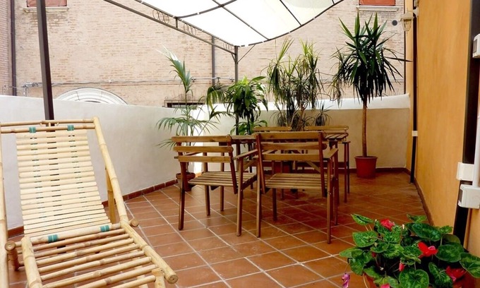 House Giulio is a bright and spacious newly renovated apartment in the medieval heart of Ferrara. Located on the first floor of a typical house of Ferrara, in the limited traffic zone and away from the city noise, the apartment consists of three rooms + services: large bedroom with a double bed, living room with sofa bed 2 places, large kitchen kitchen and bathroom with shower. In addition ', features an exclusive outdoor terrace of 30 square meters overlooking the characteristic Via Fondobanchetto, to enjoy pleasant breakfasts and dinners or just relaxing at best.