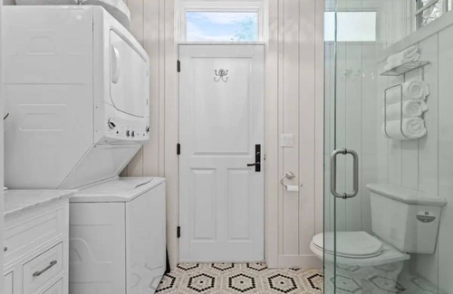 Your stay at the Historic Carriage House includes a wealth of amenities that cater to both relaxation and celebration. The property features a luxurious king bed, a cozy loft with three twin beds, and a full kitchen equipped with top-of-the-line appliances, ideal for preparing meals or hosting intimate gatherings. Other highlights include a stunning marble bathroom complete with a rain head shower, a charming electric fireplace, and a flat-screen Smart TV. With fast Wi-Fi and designated parking spaces, every detail has been thought out to ensure your comfort during your stay.