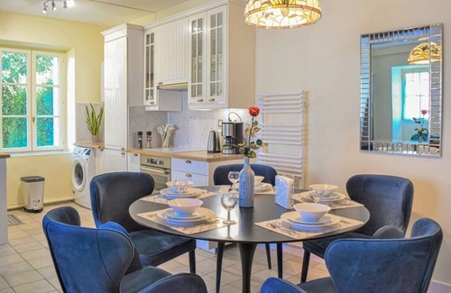 Nestled within 6 hectares (15 acres) of lush forests, serene ponds, and expansive lawns, Tour Est (the East Tower) of the historic French Chateau de la Trousse invites you to experience the epitome of elegance and tranquility. Recently renovated in a stunning Art Deco style, this tower boasts four luxurious bedrooms accommodating up to eight guests, three full bathrooms, and modern amenities that seamlessly blend convenience with charm. The full kitchen is equipped with a four-burner induction stove, large refrigerator, dishwasher, and washing machine, ensuring a comfortable stay.