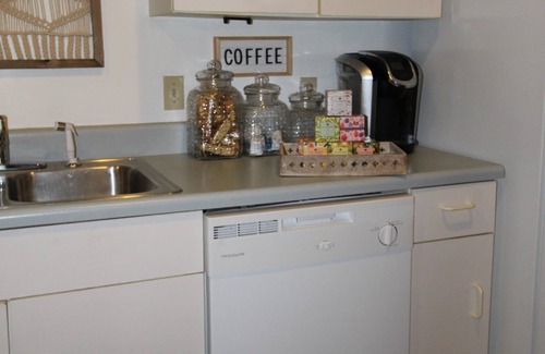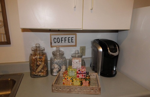 This is 2BR/1BA condo that has been decorated beautifully. It is has a fully-stocked kitchen as well as a laundry room with a washer and dryer. There is a separate area in the main living space that has an L-shaped desk, perfect for guests who are traveling for work and need a place for their laptop. The wifi code will be provided to guests during check-in. The living room is decorated beautifully, with a large couch, accent chair, and ottomans. Enjoy the 55' smart TV with YouTube TV that is accessible to all guests. If guests have their own login for other apps such as Netflix or Hulu, they can login with their own credentials . The dining area boasts an 8 foot table with benches. It can comfortably fit 6 but can seat up to 8 with two additional accent chairs that are used in the condo for additional seating. Enjoy the custom bar that was made for this space as well! The master bedroom has a king bed and the guest bedroom has a queen bed. Both also have dressers for storage and access to the closets. Enjoy the sunset view out of the windows that overlook Poindexter Street in downtown Elizabeth City. The bathroom has two separate vanities and a large shower/tub.