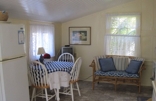 Cottage at the Cove's broad sunny front porch with wicker furniture is the perfect spot to begin the day with coffee or tea. The charming rear garden is intimate and lovely.