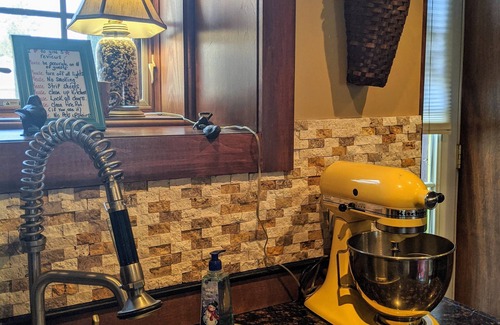 The gas fireplace is perfect for cozy evenings in the living room. You'll also find an entire wall of French doors with views of the river. Watch barges and boats sail by. Bring your own vinal or use our assortment, on a unique upright record player, or watch a movie on the new large screen smart TV. The cottage provides complimentary high-speed fiber optic internet.