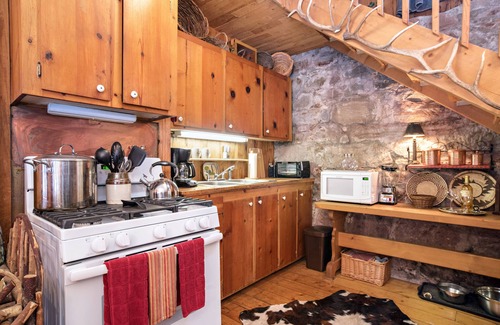 The custom leather furnishings and rugs, antler chandeliers, unique mountain decor and wood burning stove create the perfect atmosphere for an amazing mountain getaway experience. The kitchen is fully equipped to prepare meals and the dining room, with a beautiful antler chandelier, offers great views of the estate and red mountain cliffs.