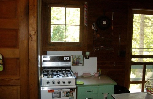 The 30 foot long front porch is screened, but also has one 12 foot screen panel hinged at the top to hook the screen out of sight. This is where the hanging dual seat and a small couch are located. On most days you will not have to lower this screen because the breeze keeps bugs from entering. The porch is relatively high up from the ground (higher than what is commonly built today), so the view of the lake is improved.