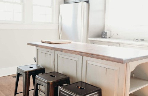 The house features a wide porch perfect for drinking coffee and enjoying the weather. The cottage is over 100 years old and has been newly remodeled to offer guests all the modern amenities needed for a comfortable stay while keeping the charm and character of a beautiful historic property. Guests will be greeted with a spacious living room with fire place, a king and queen bed, two bathrooms, a full kitchen open to the dining room featuring a large farmhouse table and a laundry room with a ping pong table and dart game. The outdoor area is fully fenced and welcomes guests to enjoy a fire pit, corn hole game, outside dining table, and a lounge deck. (Please note: for the safety of our guests, there is an outdoor camera on the porch)
