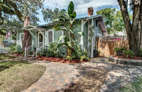 Charming historic cottage located in Sanford's desirable historic residential district. 2 bedrooms (one king bed, two twin beds) and one bath. Kitchen is equipped for cooking and has the original antique sink preserved. Back screened porch with washer/dryer for those longer stays. Off-street parking for one vehicle, private courtyard, front porch and cozy fireplace for winter nights. Walking distance to downtown local restaurants, pubs, specialty shops, RiverWalk, Lake Monroe and marina. Centrally located close to beaches, major routes, Amtrak, Sanford Airport, Orlando/Disney. Two bicycles available (at your own risk) and fishing poles for your use. Cottage is VERY clean and disinfected between guests for your safety.