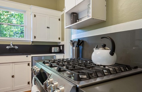 Come stay at our Craftsman Bungalow located in the heart of Bend's Historic District in Old Bend. Built in 1919, this home is on the National Historical Register. We kept the historical elements, but added modern conveniences like central air conditioning & heating, high-end dishwasher, new gas range, remote start gas fireplace and more. Sidewalks on our street make for safe & easy walking. Close to all the best that Bend offers but far enough away for quiet enjoyment! Walk to Downtown, Old Mill District, Crux & other breweries, Market of Choice, Jackson's Corner and more - all within a 5 to 10 minute walk. Bend's latest hot spot, The Box Factory, with restaurants, Immersion Brewing, Avid Cider, Spoked, Food carts, yoga and summer and winter sports gear rentals is also a 5 minute walk. Enjoy front porch sitting or relax in the private backyard. You truly get a feel for Bend and its residents in our vibrant neighborhood. Each of the 2 bedrooms has a memory foam queen bed with soft sheets and a comforter. In each bedroom closet, there is a rollaway twin bed that can be used for the 5th or 6th person (recommended for children and or small adults). The main bathroom is large and remodeled with a new walk-in shower. A second full bathroom was added in 2023 and has gorgeous period touches like marble tiling and a pedestal sink. The large remodeled basement offers room to spread out with sofa, large screen TV, beer fridge, dart board and washer and dryer machines. The private backyard has a brand new paver patio, lots of grass, a propane BBQ, comfortable seating, great sun exposure and patio sail shades. The backyard is fully enclosed with a 6 ft fence making it dog friendly & kid safe. We also provide you with 2 five speed cruiser bikes to get around town.