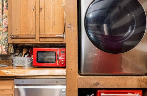 The cabin features a master bedroom with a hand-crafted King bed, constructed from hardwood sustainably harvested from fallen trees. The smaller bedroom has a twin bed. The first floor includes a small kitchenette with a two-burner induction stove, small refrigerator, microwave and convection toaster for small food prep. No oven available. Also available is a washer/dryer, living and dining area with an additional half bath.There is only ONE shower.