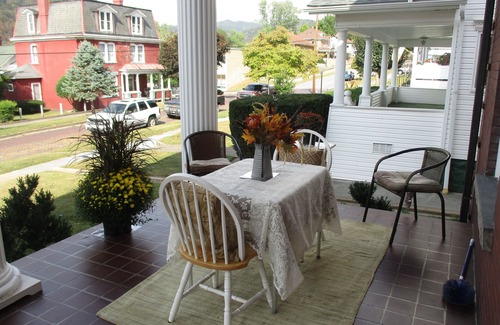 The spacious front porch with its majestic columns provides a comfortable sitting area to relax, converse, sip coffee or wine. Wifi is available for all your devices.