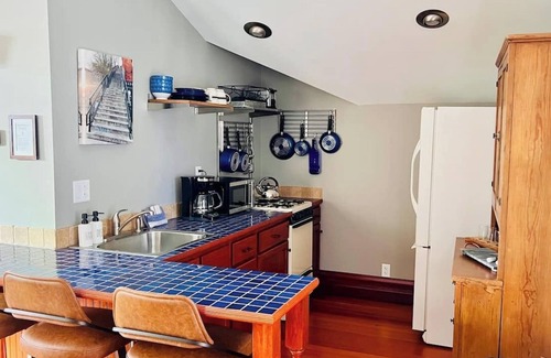 Inside, you'll find a relaxing space with a gas fireplace, queen-sized bed, a full kitchen equipped with everything you need to prepare meals, and a bathroom with a tub shower. The amenities include a TV with Fire Stick, a surround sound system, and all the kitchen essentials. For a quick eat, a coffee shop, bakery, wine store, and pub are located 2 blocks away.