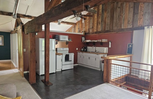 Escape to this brilliant mill in picturesque Floyd. With 2 apartments boasting 2 fully equipped kitchens, Epperly Mill totals 3 bedrooms with 2 king beds, 1 full bed, and 1 twin bed. This charming retreat offers a wonderful stay for guests. Enjoy the convenience of 2 bathrooms equipped with all the amenities you may need, as well as a bathroom located in the venue for convenience while you relax on the creekside patio with ambient lighting. The living areas in both apartments feature floor to ceiling windows inviting in the beauty Floyd and Dodd Creek have to offer. Some may come to unplug, but others may come for a peaceful place to do their work. We offer high speed internet that reaches outdoors if desired with multiple points of electricity on the patio.