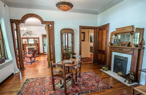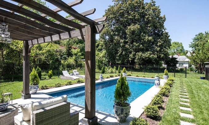 The home features three large bedrooms on the 1st floor and a smaller kids room up the tiny stairs in what was once the staff quarters. Each bedroom has a large streaming TV. The two full baths are on the 1st floor, one equipped with a hot tub. Outside is a large guesthouse where the owner lives, a koi pond with waterfall, an inviting southern front porch with a view of the church, a fenced in yard with patio and an English garden with in-ground pool. The unheated salt water pool stays open year round if you dare. This amazing home has 10 foot ceilings, original wood built ins, wide plank floors, 6 fireplaces and a fully equipped eat-in kitchen. There is a lovely foyer with archways leading to both the formal dining and living room. The back of the house has been renovated with a sun-room facing the exquisite garden and pool. This room has a 65" TV with Xfinity cable. All TV's have Netflix, Hulu, HBO, Prime and Apple streaming.