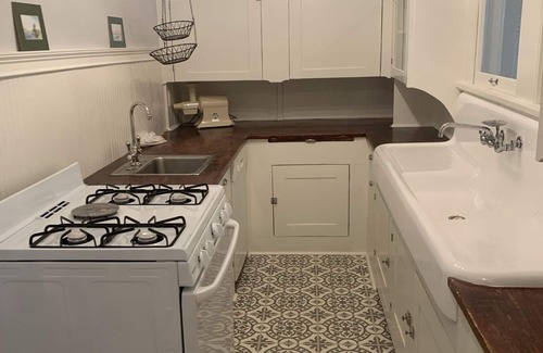 The inside of the home has tall ceilings, when you walk through the front door it opens to the living/entry room area and has access to the staircase. French doors open to the newly added kitchen area with island, dishwasher, sink, mini-fridge and stove top. The original galley kitchen is nestled to the back of the new kitchen keeping it's original charm. The original kitchen has an oven with stovetop, two sinks, dishwasher, and full size refrigerator. The laundry room is off the galley kitchen and a new half bathroom is to the side of the laundry room area. There is also a security system in place.