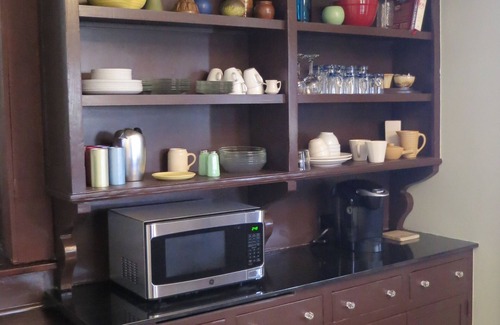 The McGregor House’s vintage warmth is complemented by its modern amenities and conveniences. The 2,000 sq.-ft. home has 2 bedrooms and a full bath on its main floor, with an additional 2 bedrooms and a half-bath upstairs. All told, the house sleeps 8 comfortably, with quality bedding and bath linens. All-new kitchen appliances make group meals fun and easy. Bar stools pull under the kitchen island, the dining room is outfitted for 6; and an extra folding table and chairs (on-site) allow for a sit-down meal for as many as 10.