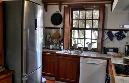 The ground floor apartment consists essentially of two centuries-old pajeros which house the living room and the master bedroom with a full double bed. In intervening newly built middle tract, the entrance area, which merges harmoniously located in a dining area with 5 seats and then. In the well-equipped kitchen with a modern cooker, baking oven, refrigerator, coffee maker and many other devices From this central area from all other rooms can be reached, as well as the second bedroom and the new bathroom with shower, bidet and toilet and a large marble vanity. From the living room and the second bedroom you can look out into the conservatory and -Go who always has a pleasant warmth even in the few cooler days. Furthermore, the apartment has a fireplace for cozy evenings and the entire house is equipped with central heating, which can be found rarely on La Palma.