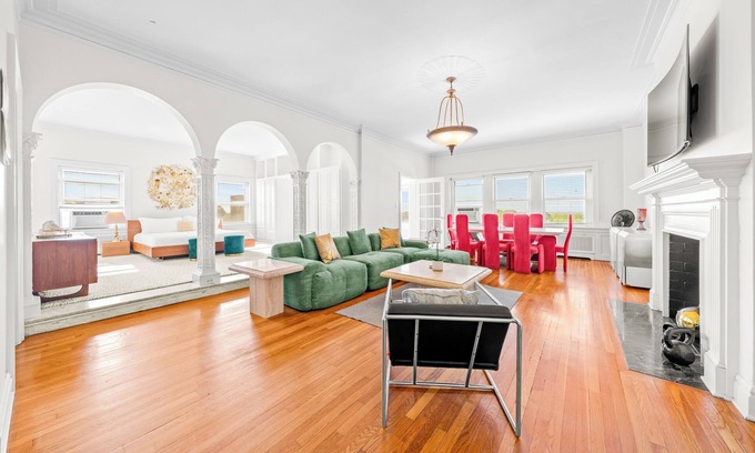 Architectural Marvel: Stunning archways grace the open-concept living space, adding a touch of grandeur reminiscent of a bygone era. These pristine white arches, complemented by intricately detailed columns, separate the living area from the cozy bedroom nook, ensuring an experience of both openness and intimacy.