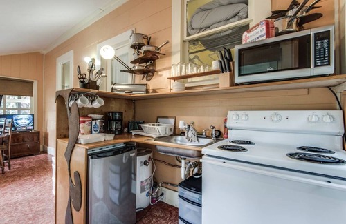 Your bedroom fills the majority of the original 'wash house' structure. You will enjoy your nightly repose on a queen-sized bed with an extra soft pillow top mattress. You will notice the original pine wood floors still run throughout the space which includes the bathroom and walk-in closet. To modernize the space a little, you will find the original claw foot tub has a wrap around shower curtain enclosure to allow you the option of a shower, in addition to possibility of an 'old western'-style long soak in the claw foot tub. Oversized towels and standard bath amenities are provided for your stay.