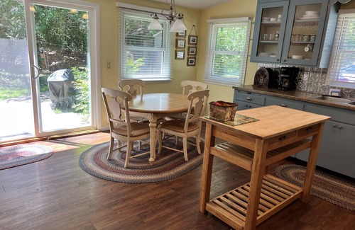 Doc’s Hideaway has a large cozy living room with a 40" HD Smart TV (with Directv), fast WiFi, a pellet stove, a main bedroom (queen bed), a full bathroom, and a high efficiency ductless AC and heating system. The large and bright kitchen and dining area are well stocked and overlook the wooded backyard which has a gas grill, outdoor table and eating area, and a fire pit. There is a narrow stairway to the large upstairs sleeping loft with two twin beds and a large seating area.