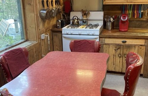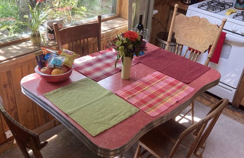 The kitchen is fully equipped to cook and bake, with a propane gas stove/oven, microwave, drip coffee maker, toaster, blender, crockpot and cooking implements. Our well water is drinkable. Complete with Fiestaware dishes, flatware, glasses, coffee, tea, oil, and some condiments.