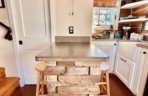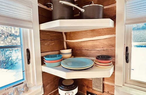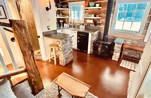 We believe big things can come in small packages. The Log Cabin is a comfortable and very well-equipped home in a small footprint. This 1890s hand-hewn log cabin has been beautifully updated into a modern, cozy space. The 15′ x 15′ floorplan includes a kitchen, dining table, sofa and wood stove, plus a full bathroom neatly tucked below the loft staircase. Thanks to the Norwegian owner (who also happens to be an engineer), this Finnish log cabin is equipped with modern mechanicals including air conditioning, in-floor heat, and a high-efficiency tankless water heater for endless hot water. To complete your log cabin experience, there is also a gorgeous glass-fronted wood stove and always a full supply of firewood available During your stay. The well-appointed kitchen on the main floor includes a 2-burner gas cooktop, farm sink, concrete countertops, an undercounter refrigerator/freezer, coffemaker, teapot, and cookware/serving ware for 2-3 guests. A microwave and countertop convection oven are also provided in the nearby closet should you need them. The upper floor provides a peaceful rest space with a full-sized platform bed, reclaimed oak flooring, vaulted ceiling, air conditioning, DVD player/monitor, and great views of the surrounding forests. Outside, the wrap-around porch covers the south and west sides and includes a custom screen enclosure for bug free lounging in the warmer months.