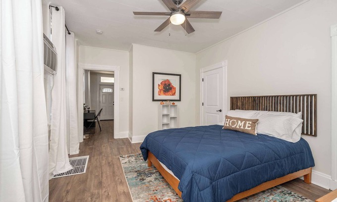 Historic Ludlow Apt A is on the ground level of the home with a private seating area on the front porch, several steps up from the charming brick sidewalk. As you enter the home, your eyes will be drawn to the ornamental fireplace and mantel. A smart tv hangs above which is faced by your choice of comfortable seating. The living room also includes a desk, perfect for your work from home setup.