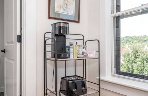 Historic Ludlow Apt B is on the second floor of the home with entry into the light-filled and fully updated kitchen. Stainless steel appliances, modern white cabinetry, and wide countertops create a space where you are sure to receive culinary inspiration. From cookware to food storage, you have everything you need to prepare meals at home which can be shared at the dining table set for 4. The home’s bathroom is just of the kitchen with walk-in shower.