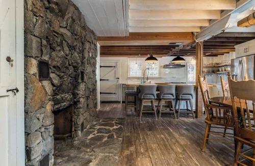 3 bedrooms, 2.5 bathrooms, with 2 stone fireplaces and large glass windows. There is a spacious backyard with a fire pit and breathtaking wooded walking trails to a nearby historic Grotto. This Lodge is perfect for romantic couples and families with small children.