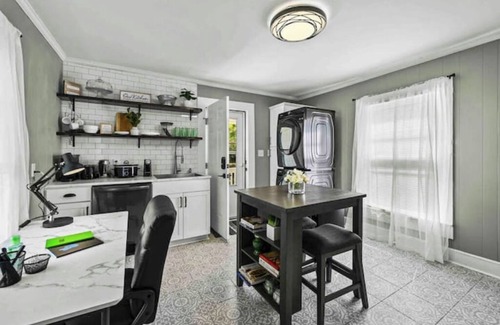 In the home the original pine hardwood floors have been restored to provide a clean modern feel. The cozy living room has lots of windows that provide natural light and a ceiling fan. The pine floors flow into the bedroom featuring Queen size bed with closet and ceiling fans. The new eat in kitchen is perfect for cooking and entertaining. You will love cooking with our new black stainless appliances including a stove, built-in microwave, French door refrigerator, and dishwasher. With subway tile, open shelving, and touches from yesterday the kitchen is bound to blow you away. The home is complete with new Samsung front load washer and dryer. The kitchen and bathroom feature tile floors. The bathroom has a large tub with shower, sink vanity and toilet.