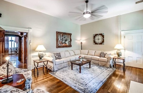 The mansion's upper levels feature seven additional bedrooms, each uniquely themed and designed to accommodate various group configurations. From The Hopkins Room's cheerful bunk bed setup perfect for families, to The Doctor Johnston Suite with its private bathroom, to the elegant John Johnston Room with king bed and upper porch access, every space offers its own character and charm. The Colonel May Room will be transitioned to a double to maintain accommodations for up to 26 guests across nine bedrooms.