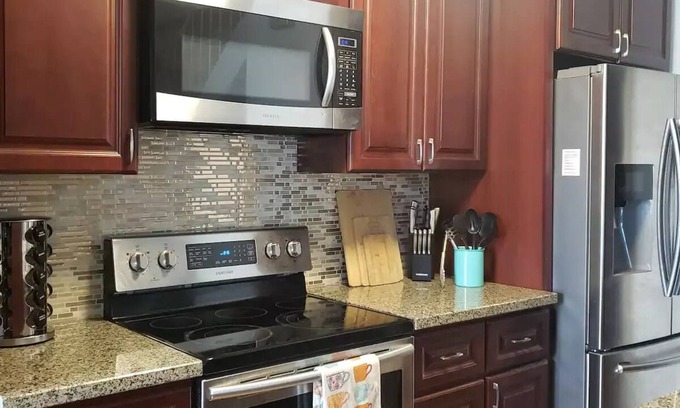 It follows the home's contemporary design while offering modern cooking appliances and spacious granite countertops that extend into a kitchen bar. Feel free to prepare delicious meals if you choose to dine in the condo.