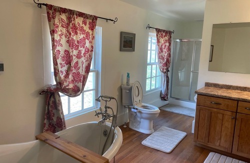 Renovation started on this farmhouse in the early 2000s. Though full of historic character, enjoy modern comforts including fully functional kitchen and stainless steel appliances, claw footed soaking tub and shower in the large bathroom, efficient heating and air conditioning, gas logs, and double filtered mountain spring water.