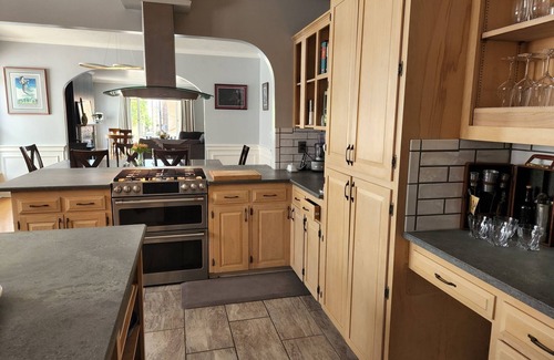 An historic 2nd story loft with 4,000+- sq. ft. of just completed renovation. 3+ bedrooms, a chef's kitchen w/6-burner gas range, quartz counter tops, a BYOB wine fridge and lots of stainless steel appliances. The kitchen overlooks the bar seating and a dining room with a wood table for 8+ and a huge living room, with gas fireplace, 75" flat screen TV with a thunderous sound bar, luxurious couches, game table and a massive Brazilian Rosewood coffee table. The great room has large windows overlooking a bustling historic urban setting surrounded by shopping, other beautiful historic buildings, eateries, and riverfront paths for biking or hiking. The entire interior has oak, fir and tile flooring.. There is a massive 17' high, bright game room at the other end of the central hallway with a slate standard size pool table, couch with hidabed and bar table with chairs, a separate stereo system and a TV visible throughout the room. The master is a suite with with one brick wall, closet, full bath, and two recliner chairs around a heater and French doors into the back hall. Altogether this is spacious, luxurious living in the heart of a revitalized historic town only 15 minutes from downtown Corvallis and OSU.