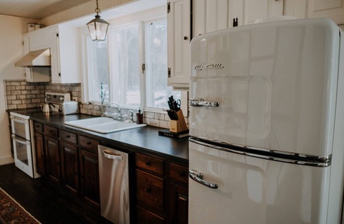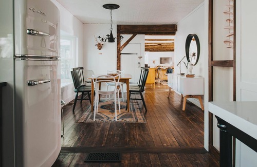 Your stay at Warner's Camp includes a wealth of amenities, ensuring comfort and convenience throughout your wedding festivities. Accommodations can host up to 12 guests, with four cozy sleeping areas, including a master suite, and a sunroom that doubles as a fourth bedroom. The inviting living space boasts original exposed beams, a wood-burning stove, and a fully stocked kitchen with modern appliances, perfect for preparing celebratory meals. Outside, unwind in the screened-in porch overlooking the river, or gather around the fire pit on the patio for evening relaxation. The cabin also features a soothing barrel sauna, ideal for post-celebration unwinding.