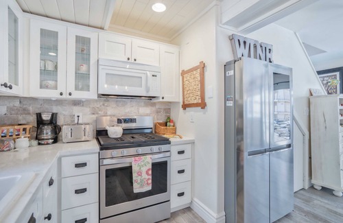 A six-block walk to the town square comes with the secluded privacy of living in the woods. The cottage is located on a hill which ends at Acker Park, a hiking preserve. A thoughtful renovation includes a blend of maintaining the historic elements of beautiful restored hardwood floors, with new appliances, cabinetry, and countertops in the kitchen and baths. The back patio gas barbeque is ideal for grilling outdoors and the wrap-around deck with gazebo is the perfect outdoor relaxation. A vaulted and beamed great room, surrounded by windows is flooded with sunlight, and adjoins the kitchen and dining areas. The second upstairs bedroom includes both a Queen and a single bed, with a trundle, so altogether sleeps six comfortably. The gated stone pathway from the front, leads through the trees to the house and is hidden from the street.