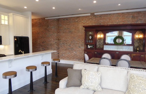 Comfortable couch with Samsung 40" Smart T.V. with Netflix + more available. Situated between the living room and kitchen is a majestic heat producing gas fireplace. Original 124+ year old hardwood floors, 11 foot high ceilings and 5 large almost floor to ceiling windows make this living room space stunningly bright and beautiful! It's a perfect combination of vintage meeting urban modern. Wi-fi included throughout apartment.